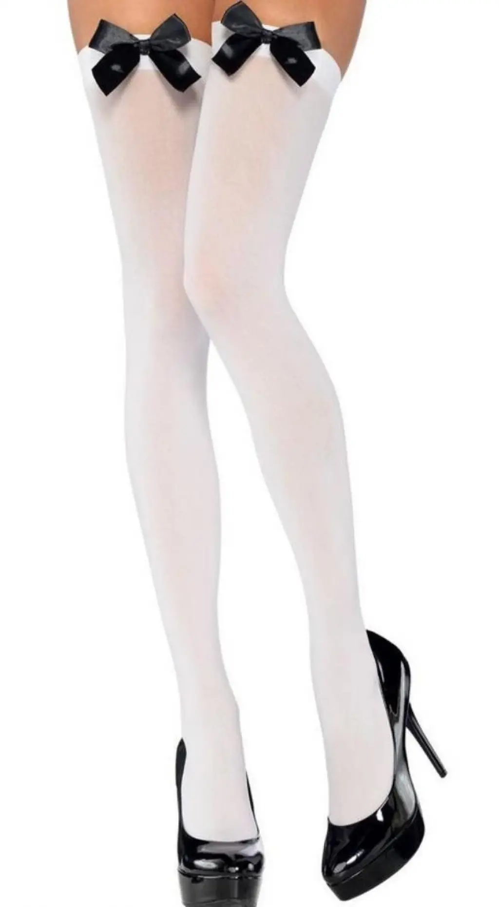 Beyaz opak dokulu jartiyer çorabı, üst bantta siyah fiyonk detayı, uyluk üstü tasarım, feminen ve zarif stil, esnek ve yumuşak yapı