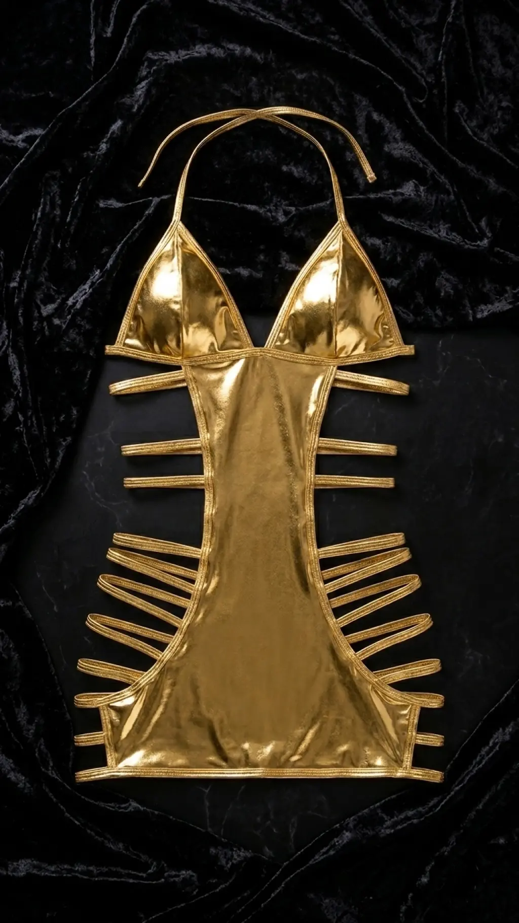 Parlak altın deri efektli kumaş, ten üzerindeki yansımalarıyla adeta sahne ışığı gibi parlar. Halterneck form, göğüsleri yukarı kaldırarak feminen çizgiyi belirginleştirir ve boyun hattını zarafetle vurgular.