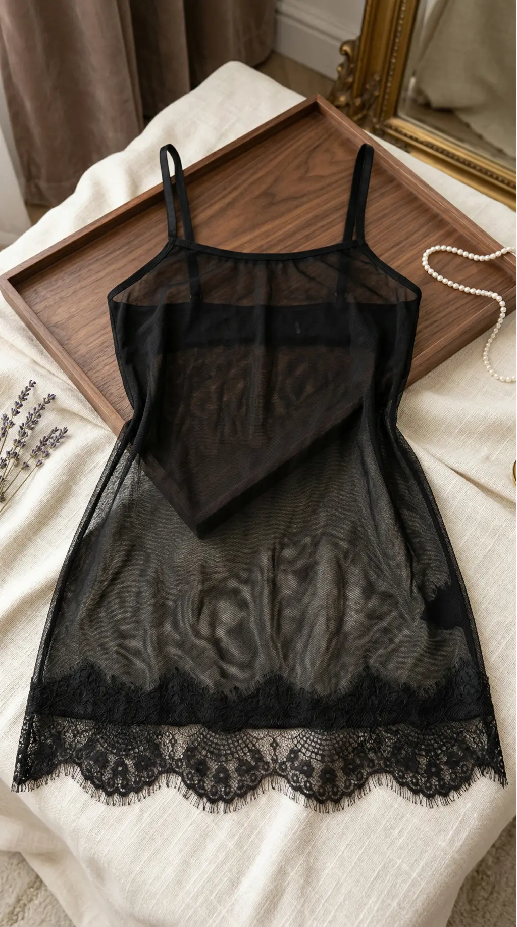 Noire Hem Lace Transparan Dantelli Babydoll Gecelik DM1295, Fransız şıklığının modern bir yorumudur. Ultra ince, nefes alan tül kumaşı tenle buluştuğunda hafiflik hissi verirken, esnek yapısı gece boyunca özgür bir konfor sunar. Şeffaf dokusu doğal kıvrımları zarafetle ortaya çıkarır, feminen bir gölge oyunu yaratır.
