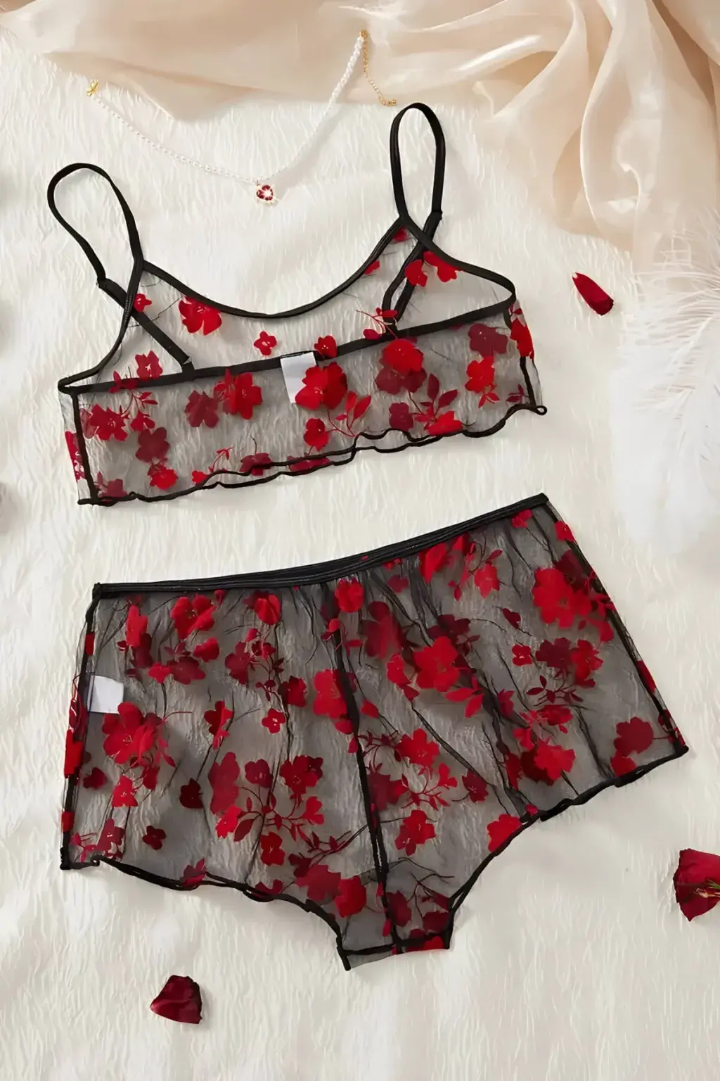 Transparan siyah tülün üzerinde yer alan kırmızı kalp flock işlemeler, hem masum hem de tehlikeli bir cazibe yaratır. Büstiyer kesim üst kısmı, ince hatları ve esnek yapısı ile bedeni zarifçe sararken, şort formu hafif dökümlü yapısıyla özgün bir rahatlık sunar.